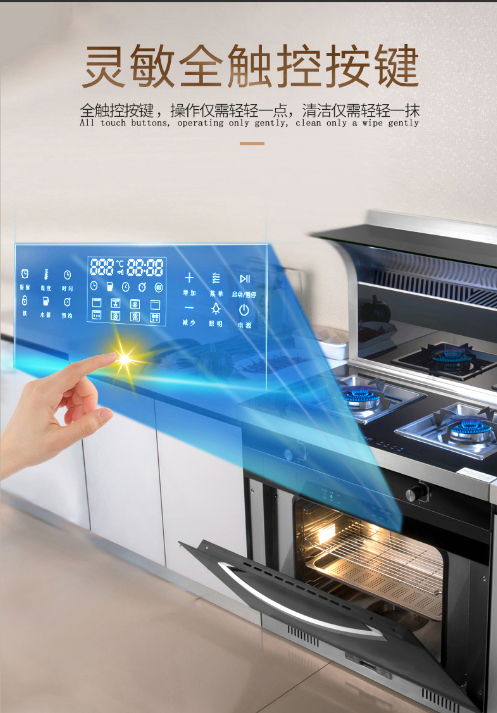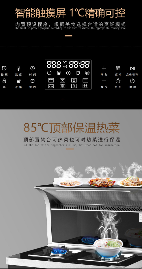 · 智能防火墙断电断气功能· 一键电热清洗、防干烧· 吸烟口后背板玻璃、恒温炉头· 塑封36叠防水防火电机· 感应开关液晶智能显示屏· 整机包边、台面圆角防漏液···