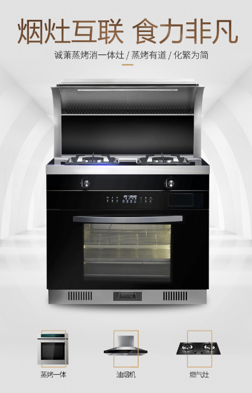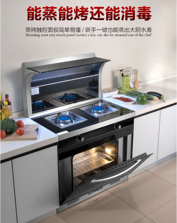 ·防火墙断电断气功能,电子定时·电热清洗、大平台置物架·吸烟口后背板玻璃·塑封36叠防水防火电机·感应开关液晶智能显示屏·整机包边工、台面圆角防漏液·烟灶联动智···